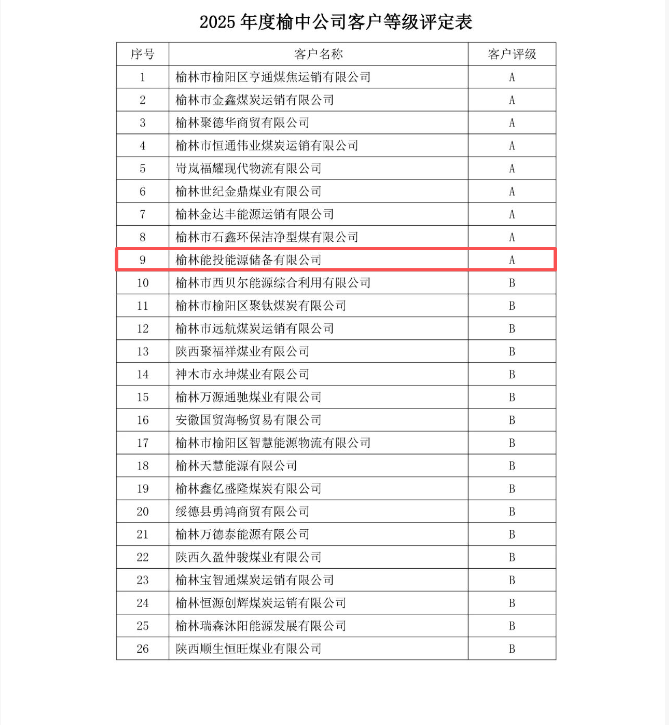 榆林能投能源储备有限公司获陕煤运销集团榆中销售有限公司2025年度地销客户分级“A级”认定,这份殊荣是对公司稳健经营业绩与扎实综合实力的充分认可,彰显了公司在行业内的核心竞争力与良好发展态势。